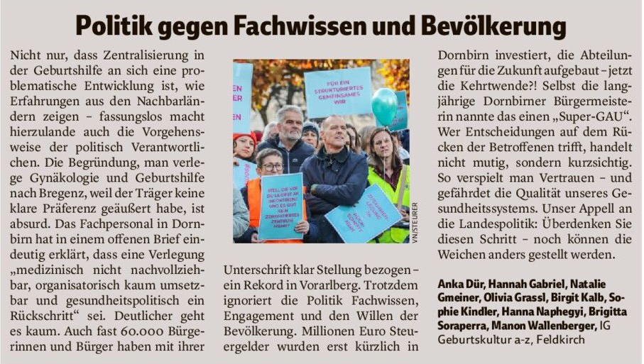 Vorarlberger Nachrichten, am 14/15. Juni 2025 anlässlich der drohenden Schließung der Geburtenstation im LKH Bludenz.